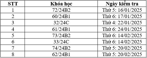 Thông báo Lịch kiểm tra kết thúc khóa học Tháng 1/2025 và Tháng 2/2025